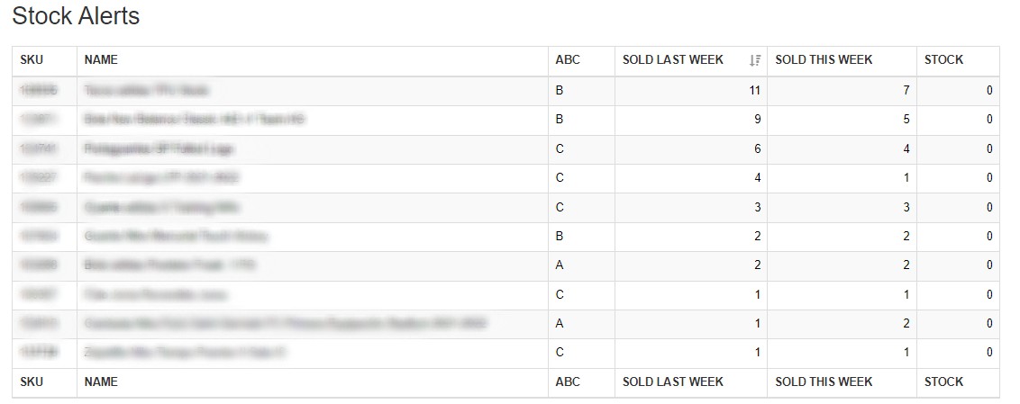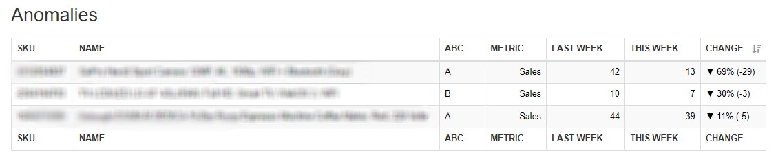 Show product we detect for a defined metric (sale usually) that has decrease o increase that metric compare to previous week. We show a table with this information: