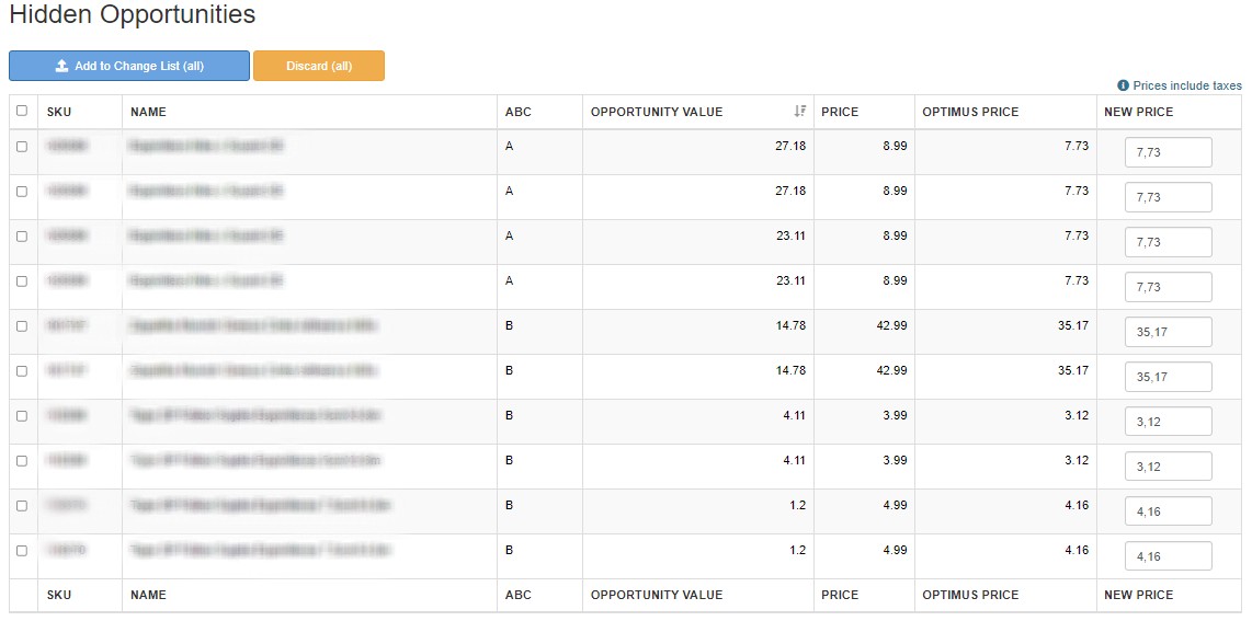 Show product we detect the client could sell more at a different price. We show a table with this information: