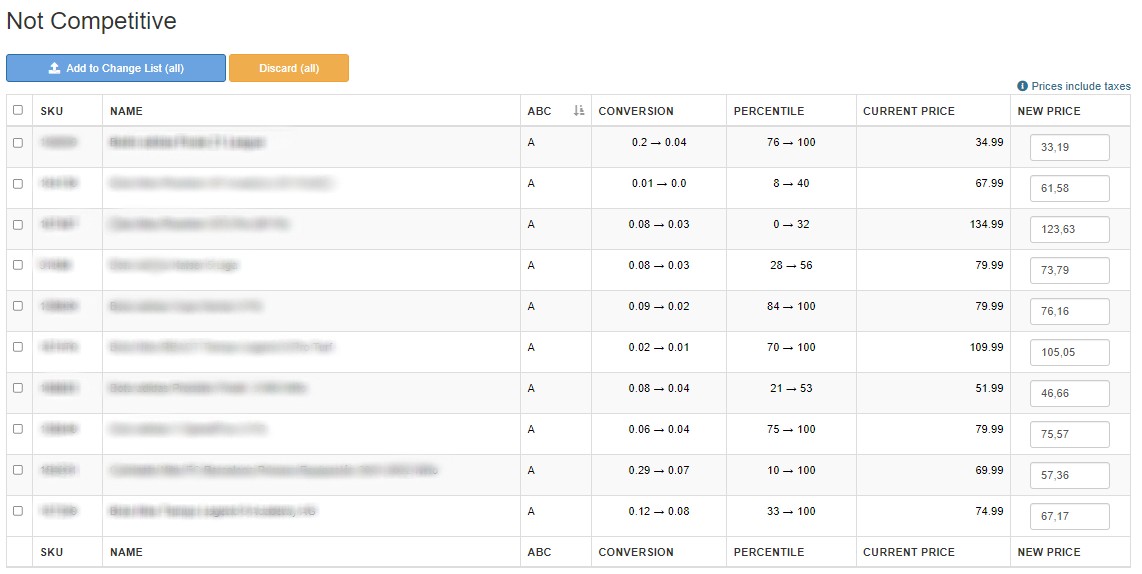 Show product we detect that the conversion rate has decreased and the percentile position has increased, as a sign that one competitor has changed their price in a way that affects your sells. We show a table with this information: